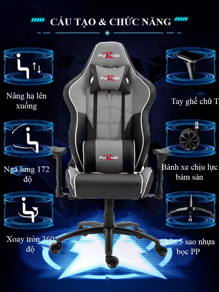 – Tích hợp các tính năng cơ bản như nâng – hạ, xoay 360º và cơ chế ngả 170º để bạn có thể nghỉ ngơi giữa trận đấu hay ngủ ngay trên ghế